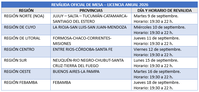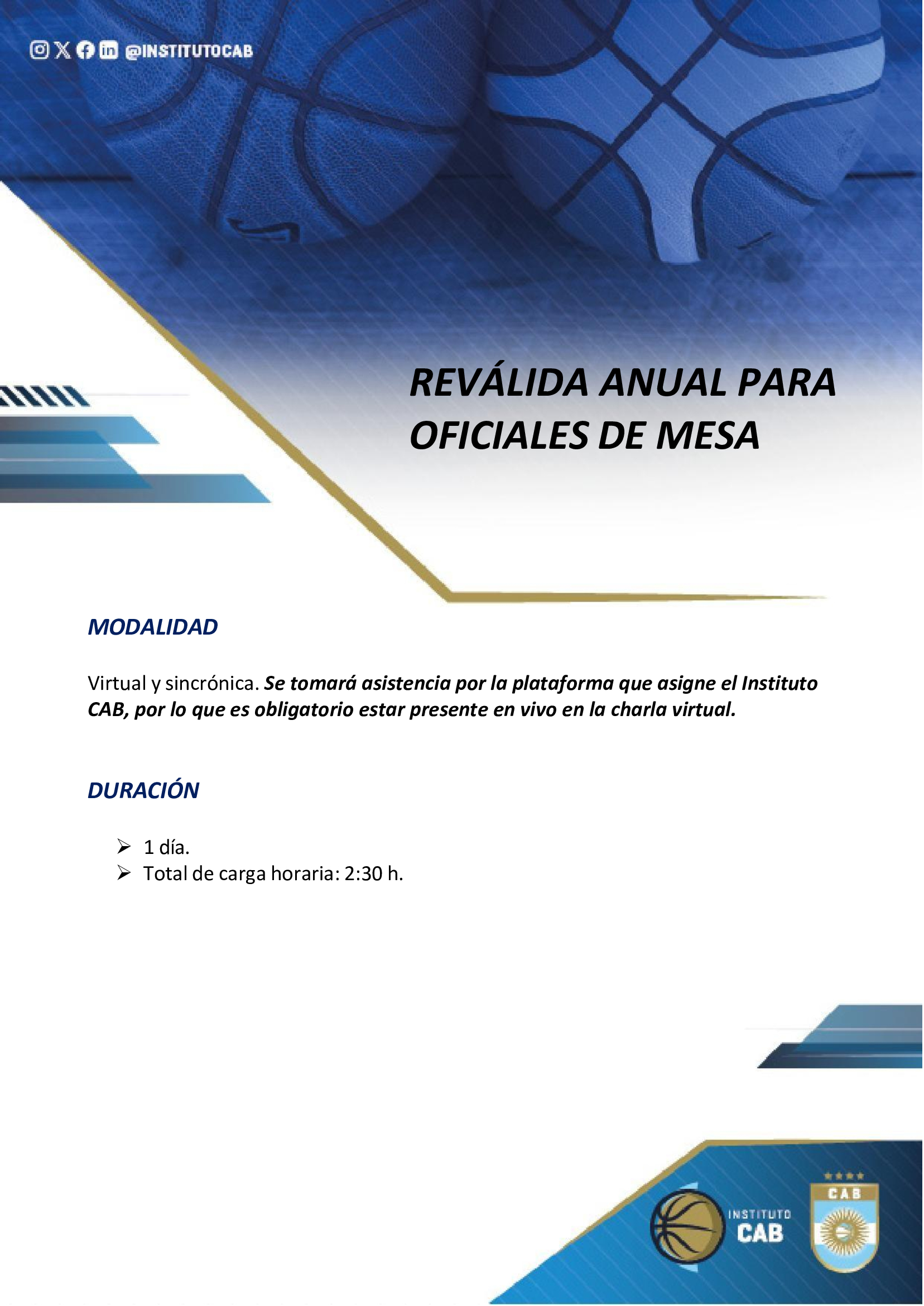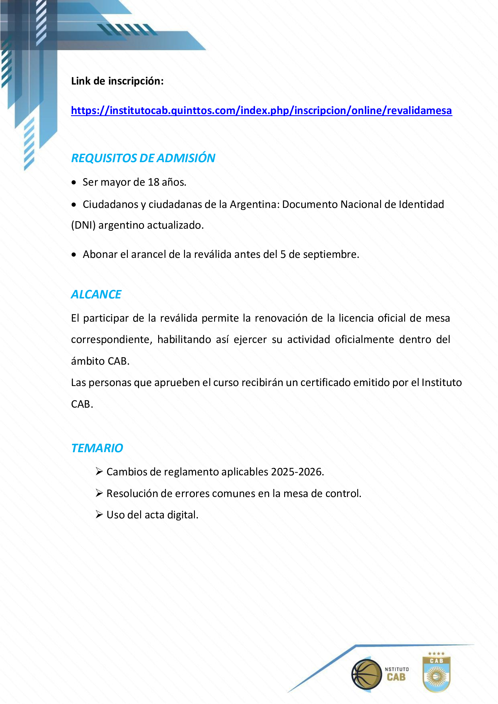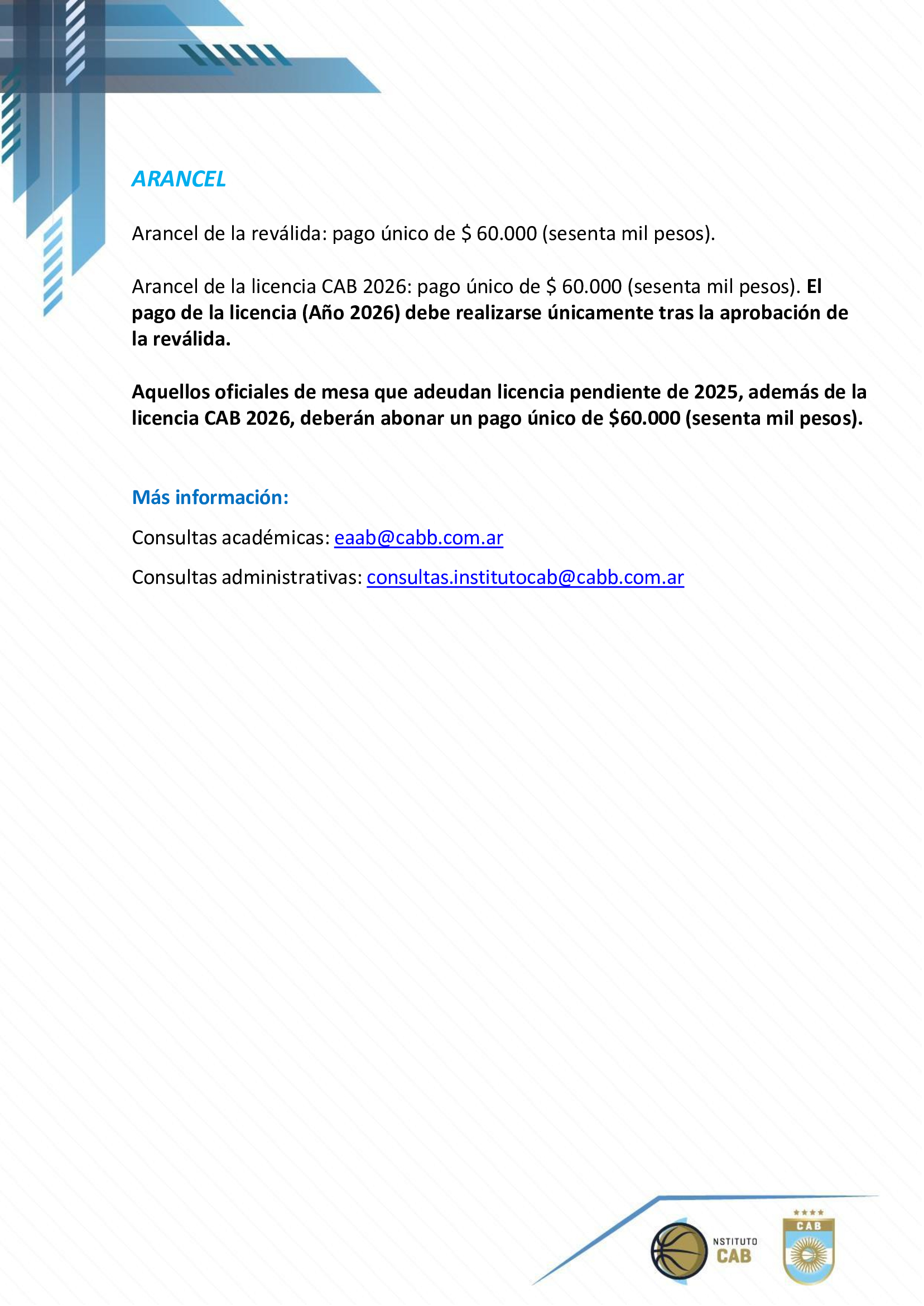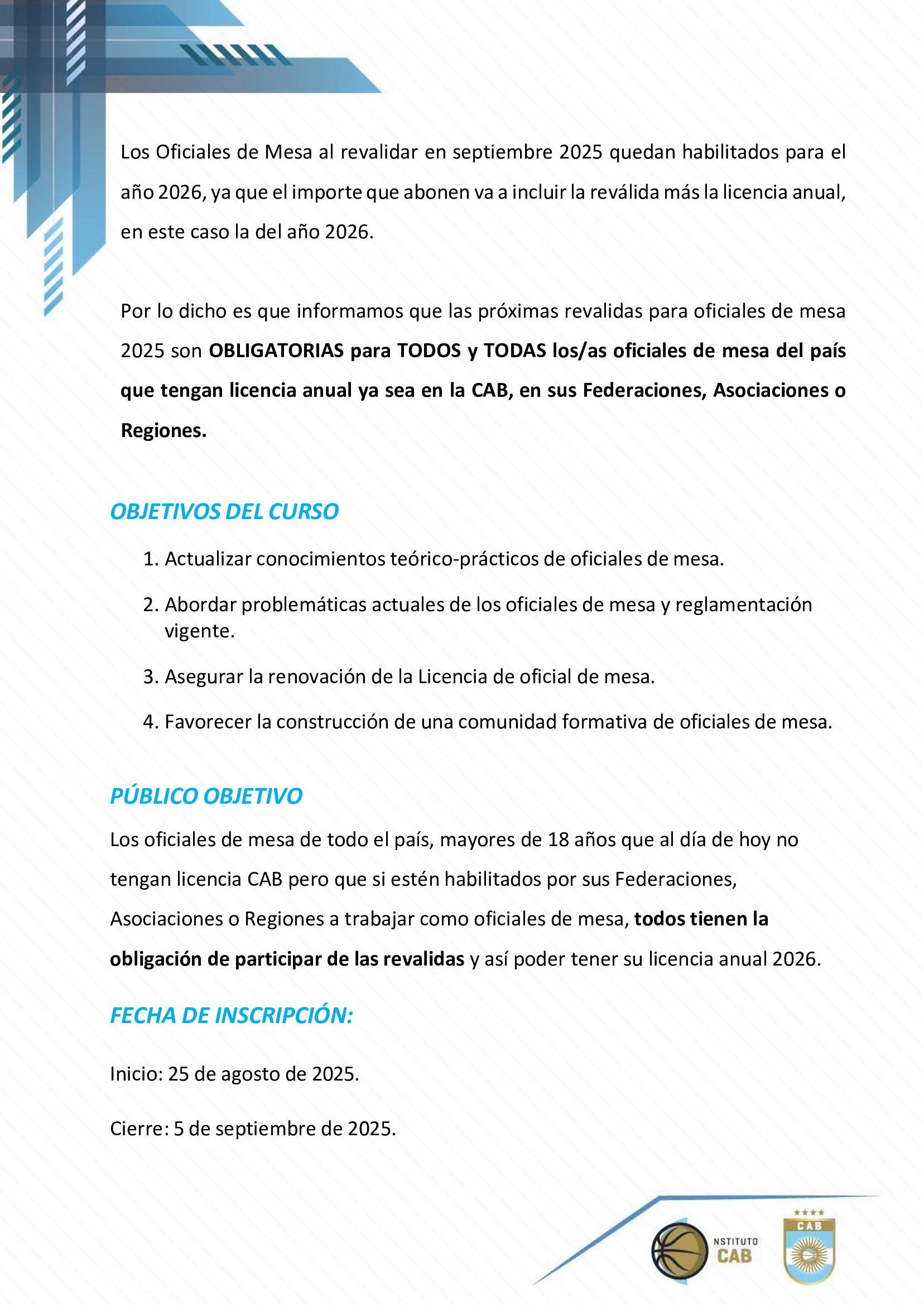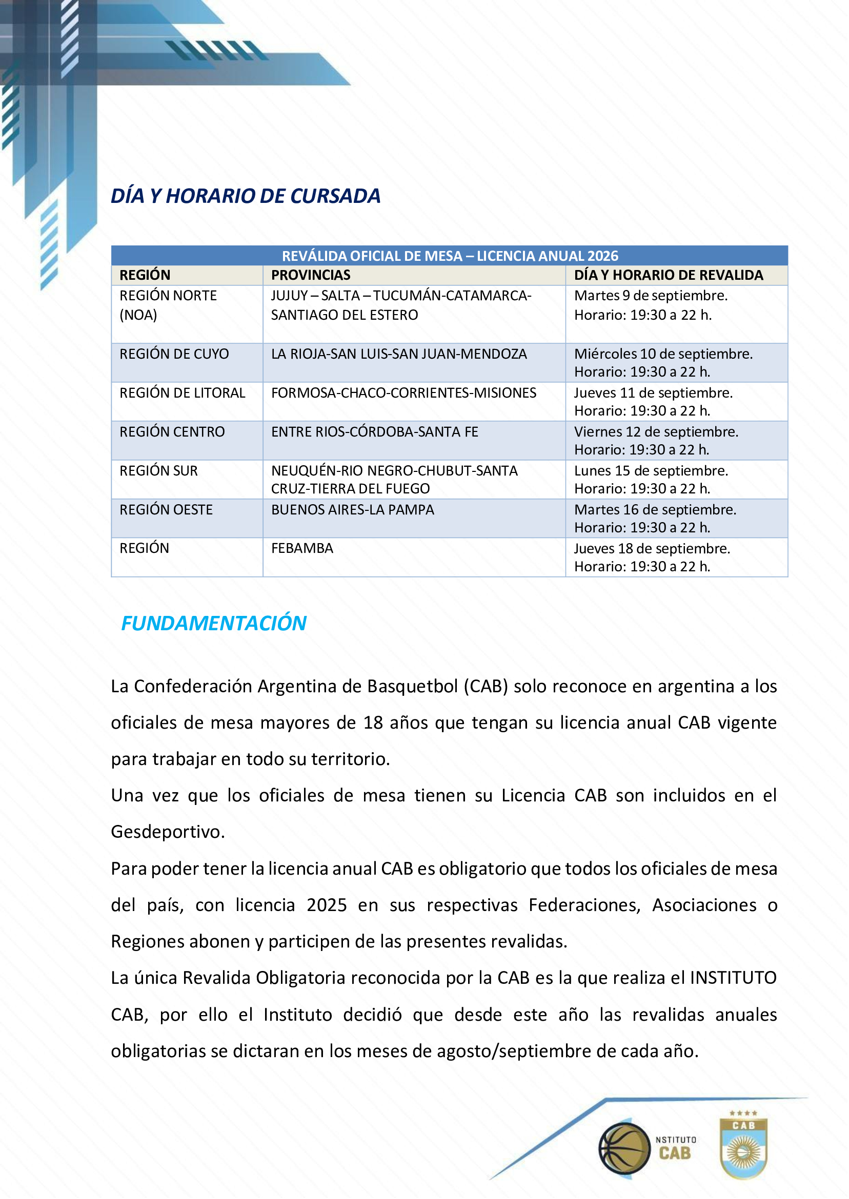 La Confederación Argentina de Básquetbol (CAB) reconoce únicamente a los oficiales de mesa mayores de 18 años con licencia anual vigente, quienes son incorporados al sistema Gesdeportivo. Para renovar la licencia 2026, es requisito indispensable participar y abonar la reválida 2025, que será dictada exclusivamente por el Instituto CAB durante los meses de agosto y septiembre. Al realizar la reválida en septiembre 2025, el oficial quedará habilitado automáticamente para toda la temporada 2026, ya que el pago incluye tanto la reválida como la licencia anual correspondiente.