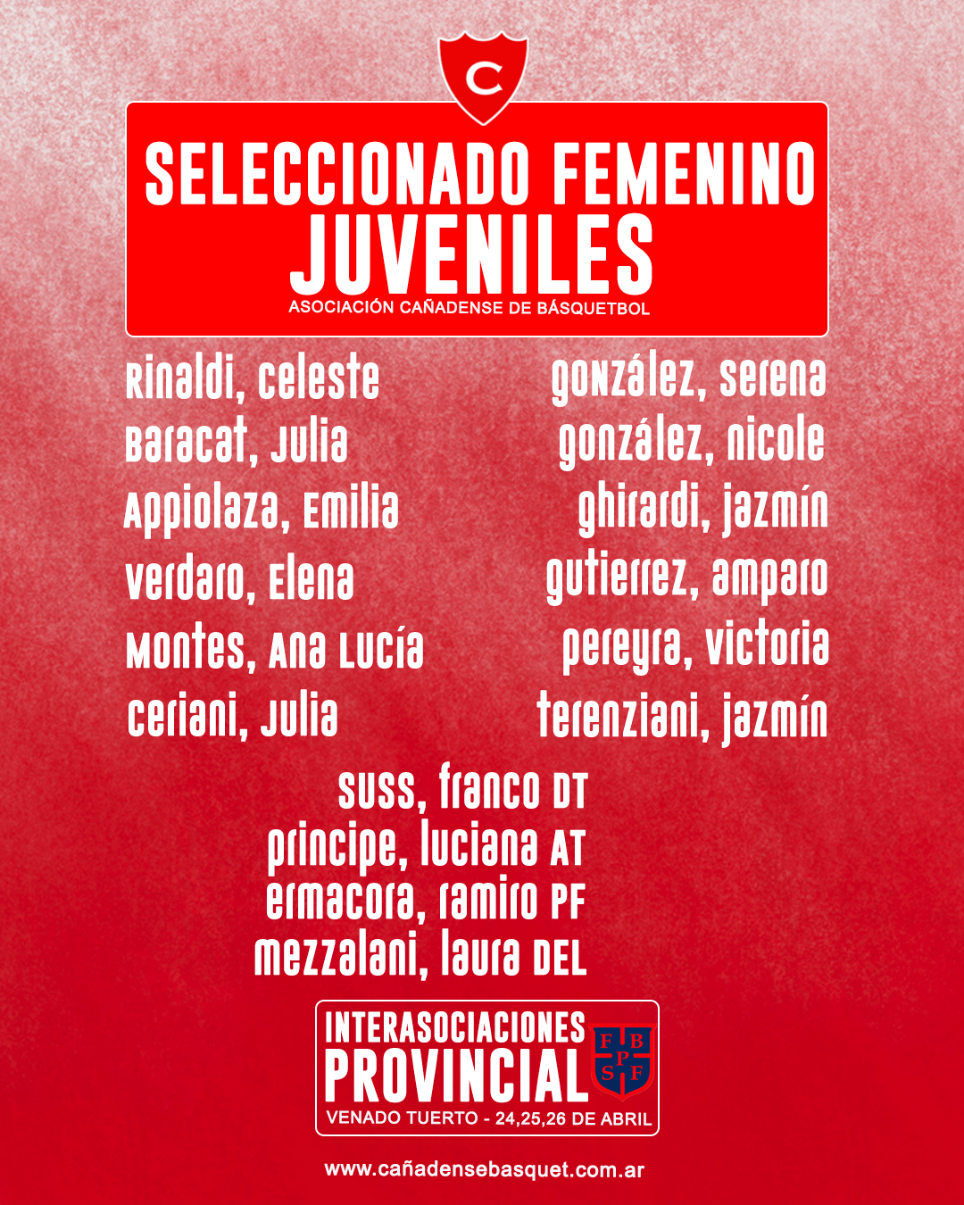 La Asociación Cañadense de Básquetbol comunica el plantel definitivo de la Selección Juvenil Femenina (Sub 17), que representará a la Asociación en el próximo compromiso provincial.
